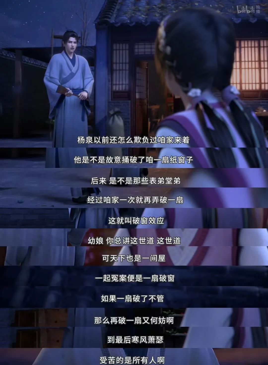 从部分角色台词和内心独白也能看出古现代社会思想的异同,以及创作者本身对历史事件和人物的理解看法。比如主角杨麟没少吐槽十四五岁的妹妹幼娘身上体现的根深蒂固“男尊女卑”思想。