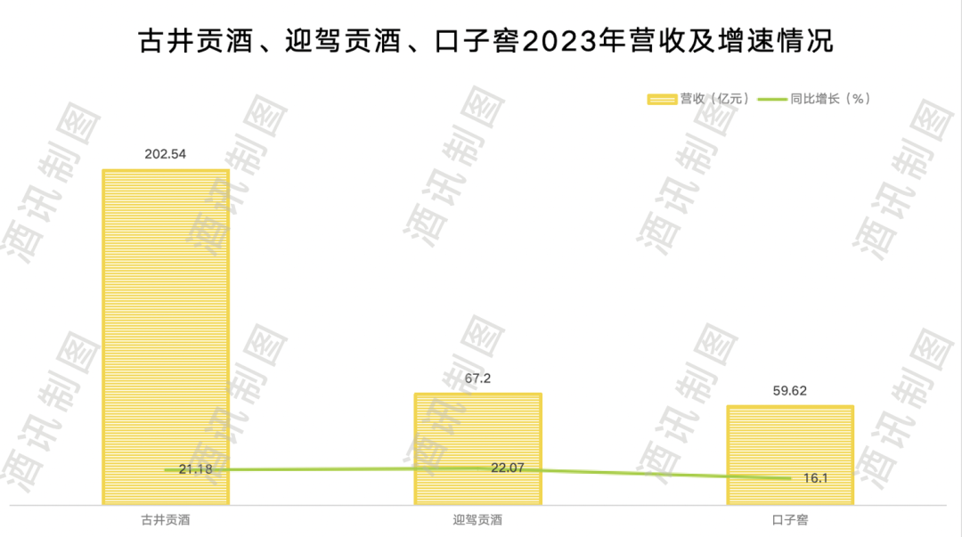 而“徽酒老大”古井贡酒,更是以极快的增速拉开了与后排玩家的距离。2017年,口子窖的全年营收为36亿,而古井贡酒的全年营收为69.7亿,其差距不到一倍。到了2023年,古井贡酒的全年营收为202.5亿,是口子窖的三倍多。