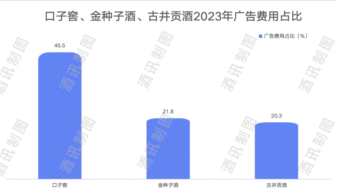 花式卖酒背后是营销费用真金白银在作支撑。2023年,口子窖的广告营销费用为3.77亿元,占到全部销售成本的45.5%。而同为四大徽酒的金种子酒广告费用占销售成本比例为21.8%,古井贡酒为20.3%。由此可见,与同类酒企相比,口子窖投入了更大力度进行营销,重视程度可见一斑。