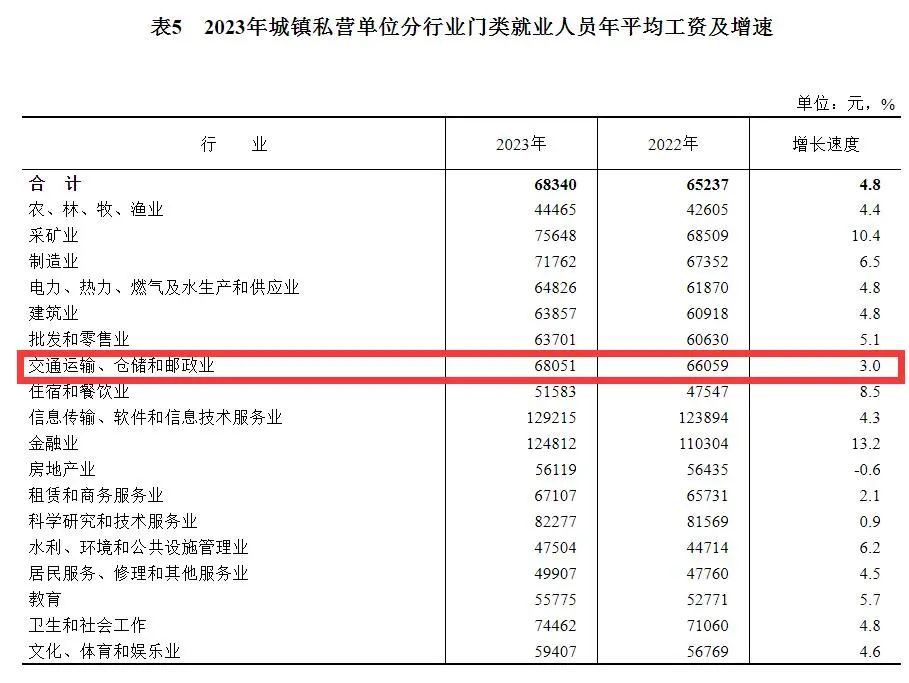 亿豹网发现,统计显示,交通运输、仓储和邮政业的工资水平处于所有19个行业门类的中上游水平,表明整个行业仍然比较有就业吸引力,但增长速度仅高于房地产、租赁业、技术服务业这三个行业,也凸显出行业发展的压力所在。