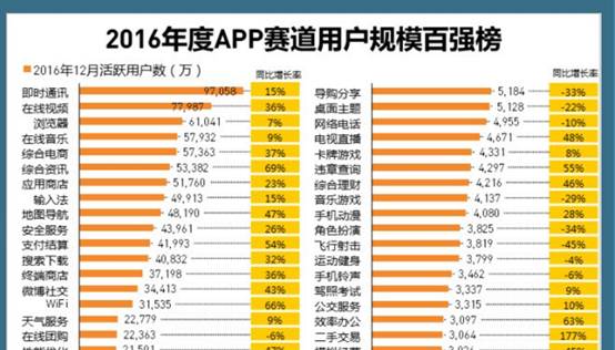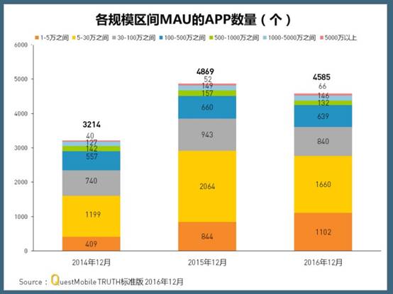 而有一份数据报告也显示,2016年12月活跃用户在5000万以上的APP只有66个,同比2015年的52个有提升。而月活在1000-5000万的APP有1660个,相比2015年的2064个有大幅下滑。