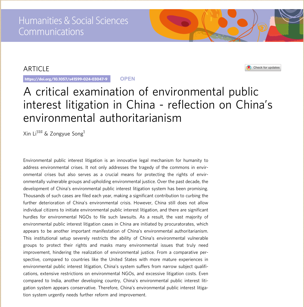 据青岛科技大学消息,青岛科技大学法学院李鑫教授团队在Humanities & Social Sciences Communications期刊2024年5月发表学术论文“A critical examination of environmental public interest litigation in China - reflection on China’s environmental authoritarianism”。该论文的第一作者&通讯作者为李鑫教授,第二作者为李鑫教授指导的硕士研究生宋宗越。Humanities & Social Sciences Communications(《人文与社会科学通讯》)为Social Sciences Citation Index(SSCI)以及Arts& Humanities Citation Index(A&HCI)两个权威数据库源刊,致力于人文科学、社会与行为科学所有领域的高水平研究,具有良好的全球影响力。Humanities & Social Sciences Communications(《人文与社会科学通讯》)位于国际JCR分区一区,中国科学院期刊分区社会学大类二区。