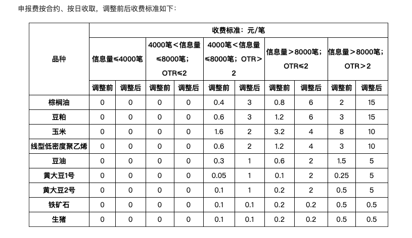 5月23日,大商所发布关于调整部分期货合约申报费收费标准的通知。经研究决定,自2024年6月3日交易时(即5月31日晚夜盘)起调整棕榈油、豆粕、豆油、黄大豆1号、黄大豆2号、玉米、线型低密度聚乙烯期货合约的申报费收费标准,申报费收取方式及其余期货合约申报费收费标准等维持不变。