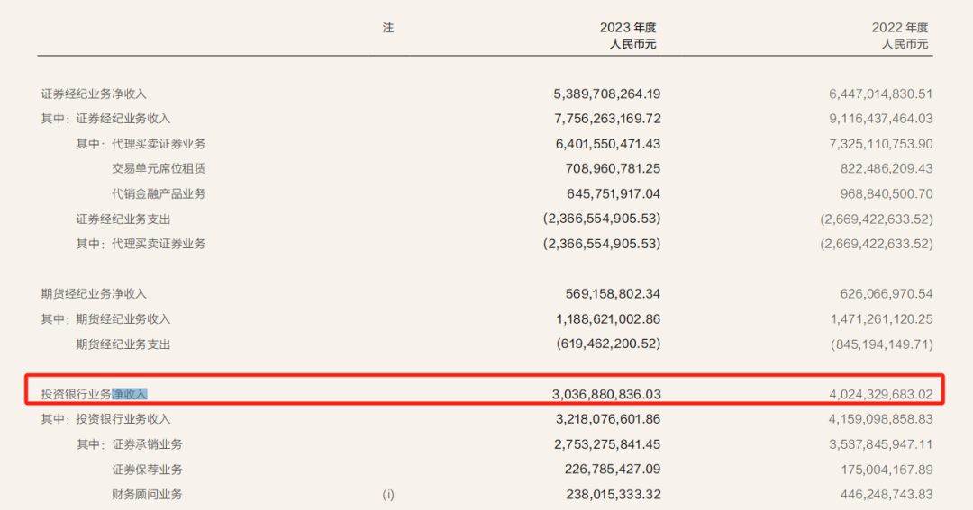 在IPO承销金额下滑的影响下,华泰证券投行业务收入也出现下滑。数据显示,2023年公司实现投行业务收入30.37亿元,同比下滑24.5%。