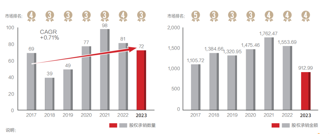 数据显示,2023年华泰证券股权主承销数量(含IPO、增发、配股、优先股、可转债、可交换债)72单,排名行业第三;承销金额为912.99亿元,排名行业第四。无论是承销数量还是承销金额,都出现下降。
