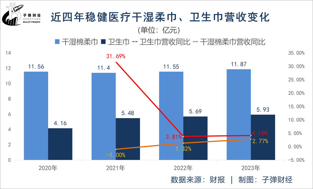 干湿棉柔巾、卫生巾等大单品则增速缓慢,营收天花板逐渐“显现”。近四年,干湿棉柔巾营收规模维持在11亿元左右,没有很大起色;卫生巾营收规模不超过6亿元,且近两年营收增速均在5%以内。