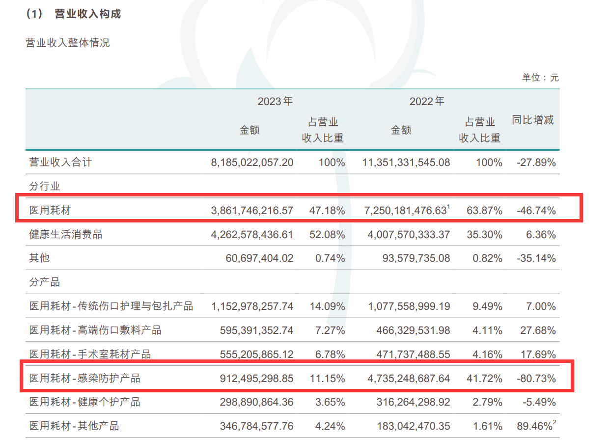 2023年,公司医药耗材板块营收38.6亿元,同比下滑47%。其中,感染防护产品营收9.12亿元,较上年同期的47.35亿元大幅减少约38.2亿元。