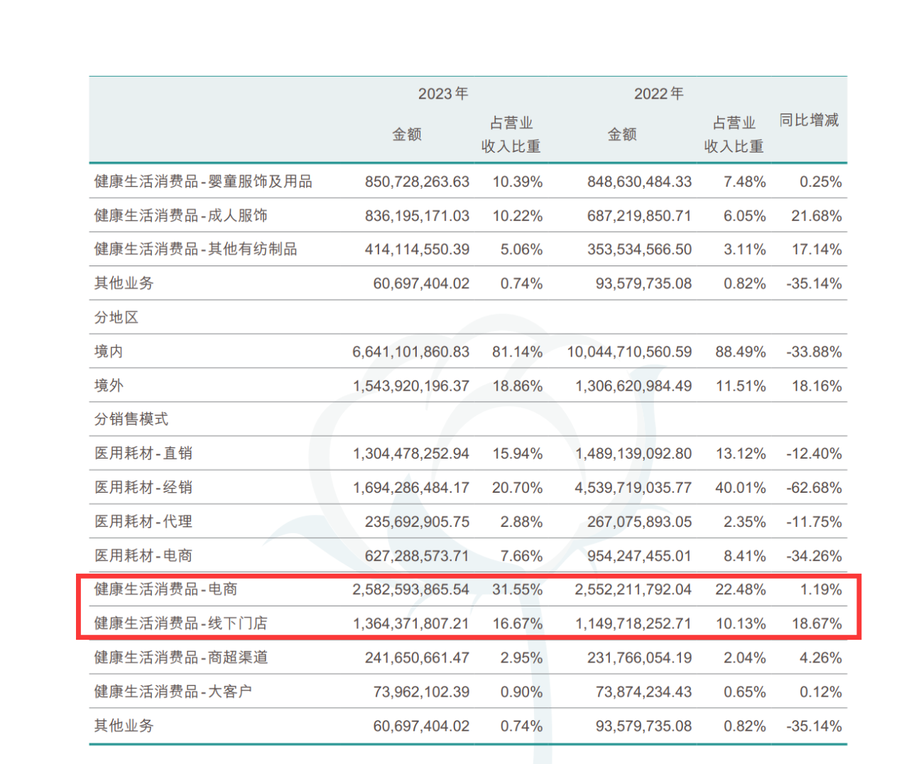 相较于线下门店,健康生活消费品板块电商渠道营收增长缓慢,2023年贡献营收25.8亿元,同比增长仅1.19%。这也从侧面说明,在电商市场,公司的健康生活消费品仍面临着较大的市场竞争。