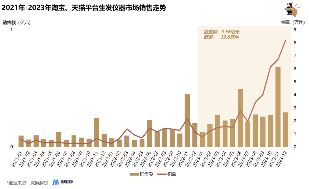 2021年至2022年初,生发仪器市场处于蓄水期,月均销售额不足千万。随着众多品牌在去年618、双11期间发力,不断拉高市场销售高点,助推生发仪在去年的销售曲线达成指数型增长。