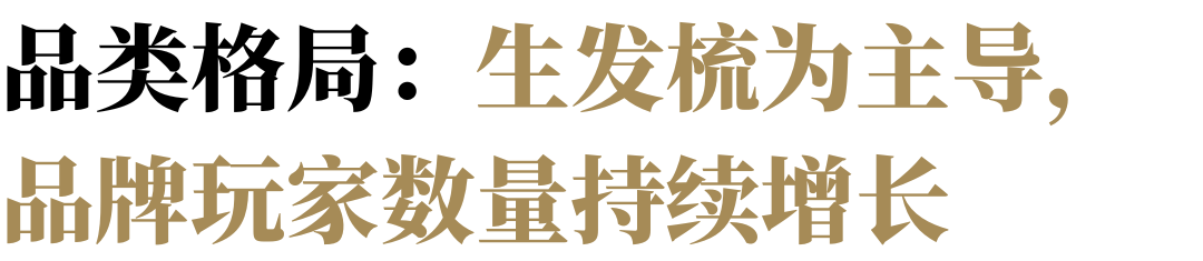 生发梳目前是生发仪器市场的核心品类,市场仍处于发展初期,品牌玩家数量较低,大众的品类认知度较低,对新兴品牌仍留有较好的入局机会和空间。