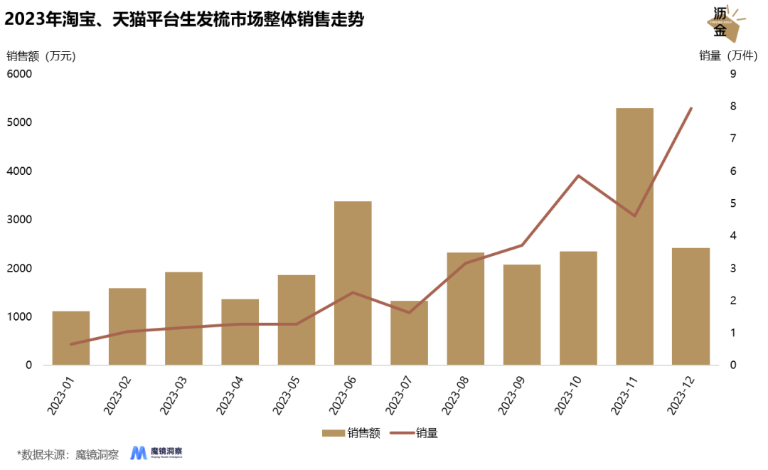 2023年淘宝天猫平台生发梳市场规模达到2.7亿元,同比增长110.4%,销量达到34.6万件,同比增速高达237.3%。