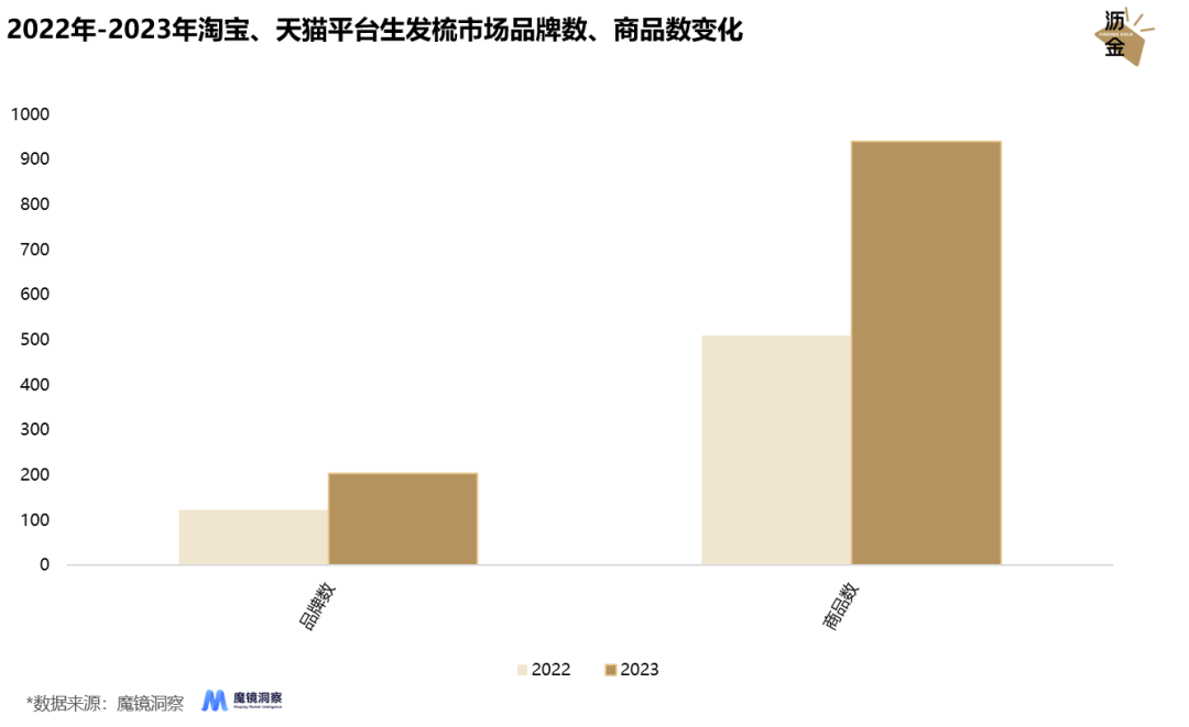 2022年-2023年淘宝、天猫平台生发梳市场品牌数、商品变化