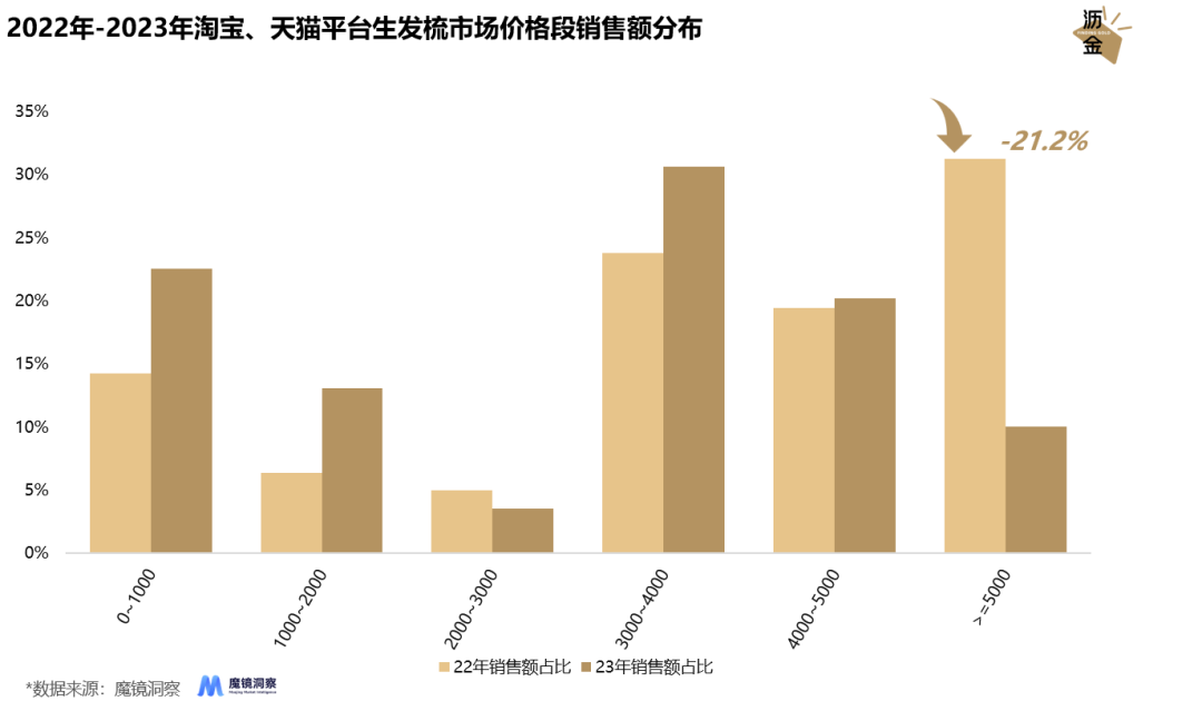 目前3000-4000元是生发梳市场的核心价格段,市场整体呈现向中低端价格段迁移的趋势。相较于2022年,5000元以上的销售额占比出现大幅下滑,从31.2%下滑至10.0%。