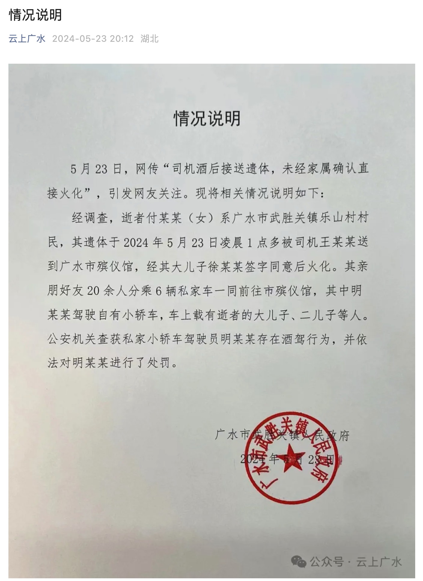 湖北随州广水市武胜关镇人民政府发布情况说明:5月23日,网传“司机酒后接送遗体,未经家属确认直接火化”,引发网友关注。经调查,逝者付某某(女)系广水市武胜关镇乐山村村民,其遗体于2024年5月23日凌晨1点多被司机王某某送到广水市殡仪馆,经其大儿子徐某某签字同意后火化。其亲朋好友20余人分乘6辆私家车一同前往市殡仪馆,其中明某某驾驶自有小轿车,车上载有逝者的大儿子、二儿子等人。公安机关查获私家小轿车驾驶员明某某存在酒驾行为,并依法对明某某进行了处罚。