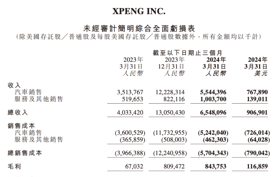 小鹏汽车2024一季度收入构成,图源2024年一季度财报