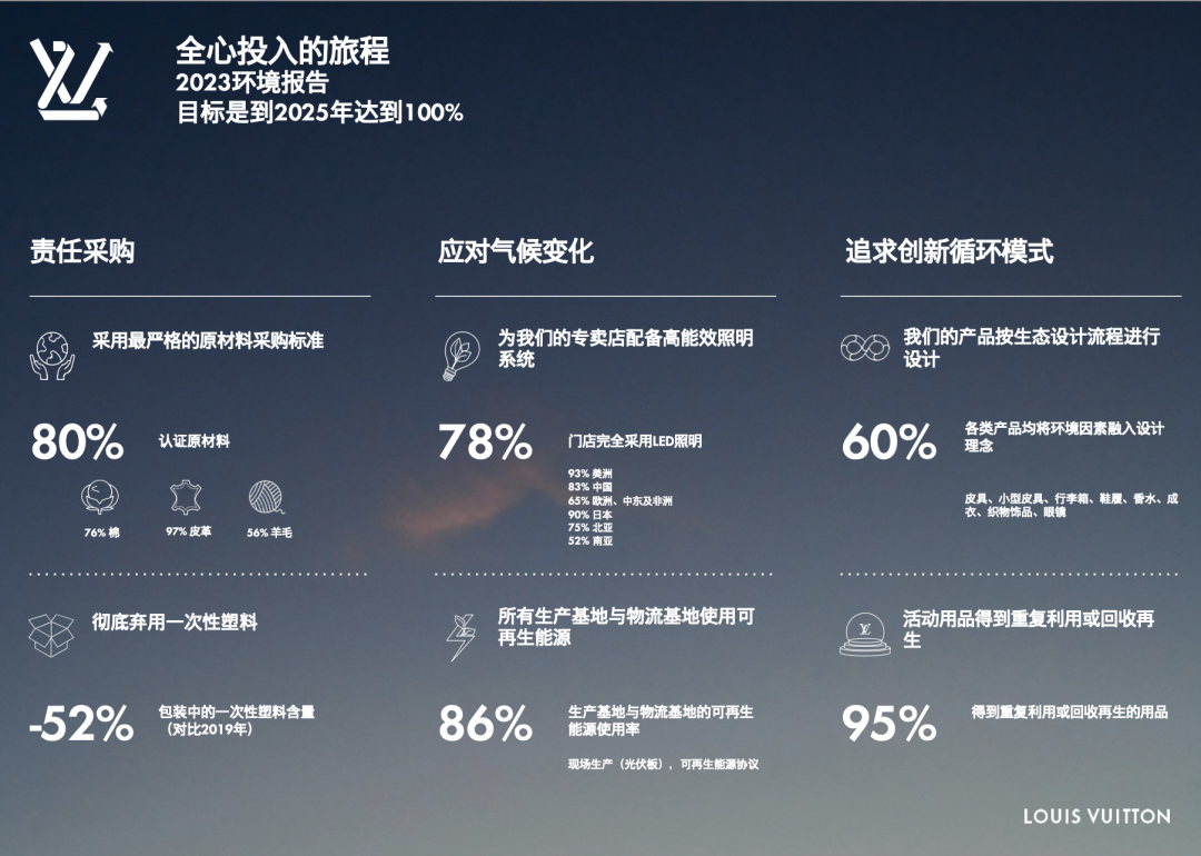 近日,LVMH集团旗下法国奢侈品牌LOUIS VUITTON发布2023环境和社会责任报告,分享可持续发展蓝图“全心投入的旅程”2023年成果的同时,宣布成为首个可再生奢侈品牌的目标