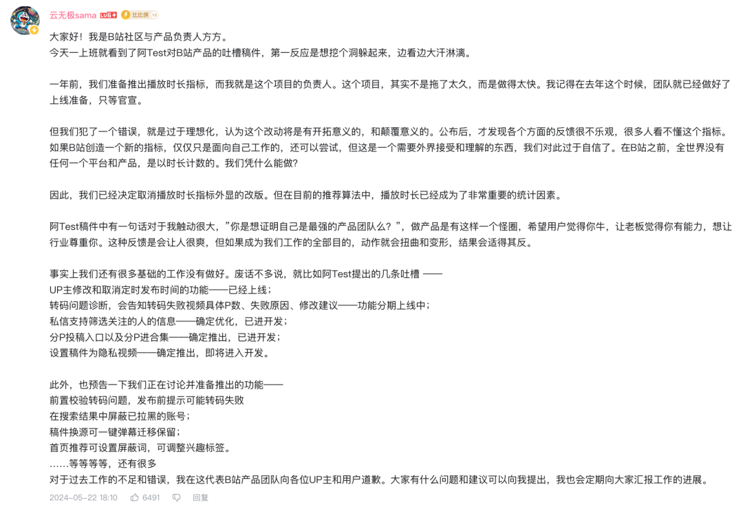 5月21日,B站知名UP主@阿TEST正经比比发布《B站说改播放时长,1年了还没改出来?》视频,吐槽这一重大策略的落地难和其他产品槽点。5月22日,B站社区与产品负责人方方在评论区回应,表示“我们已经决定取消播放时长指标外显的改版”。