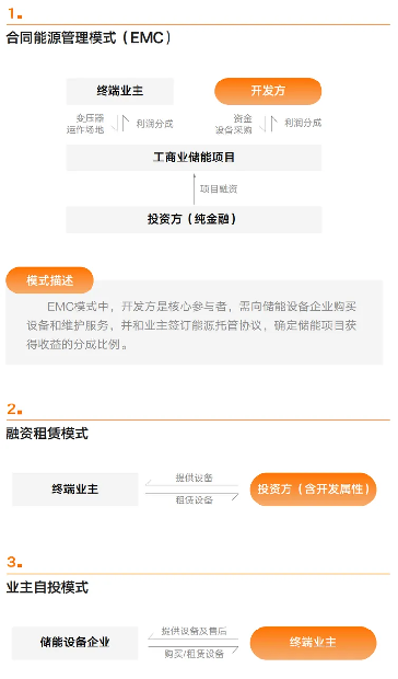 开发模式也更加清晰。工商业储能项目开发模式有3种:合同能源管理模式(EMC)、融资租赁模式、业主自投模式。
