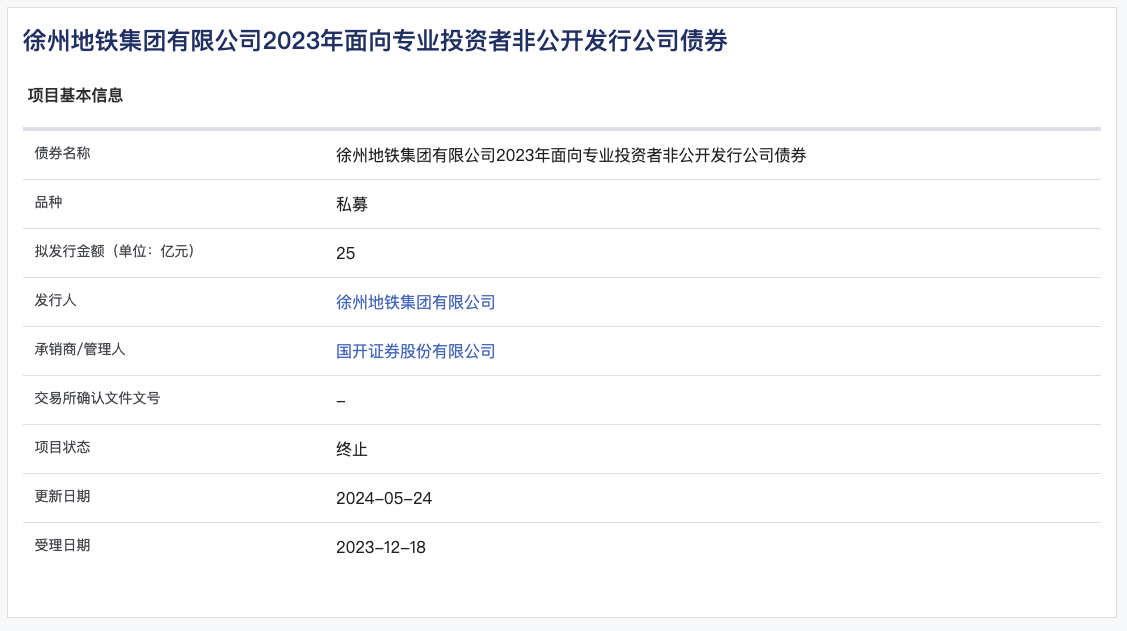上交所公司债券项目信息平台显示,徐州地铁集团有限公司25亿元私募债项目状态更新为“终止”,更新日期为2024年5月24日。