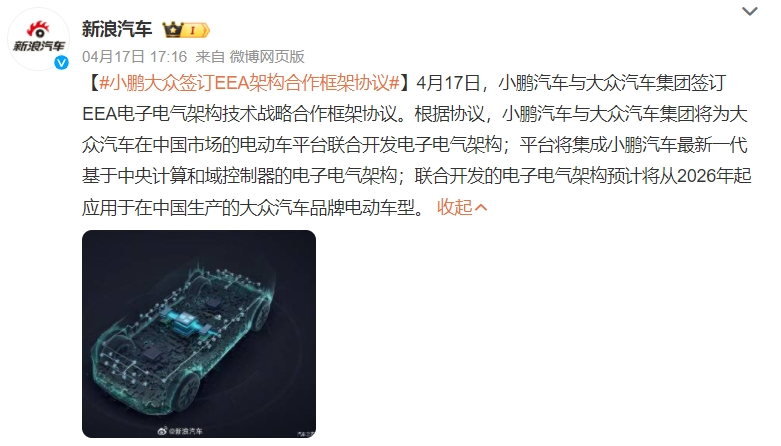 4月17日,小鹏与大众又签订电子电气架构技术战略合作框架协议,双方联合开发的电子电气架构预计将从2026年起应用在中国生产的大众汽车品牌电动车型。
