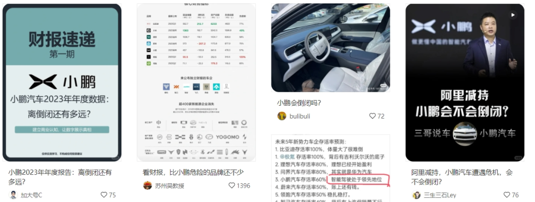 这些质疑的声音,一方面来自小鹏汽车今年前4月销量“月月不过万”的表现,一方面来自财报数据的环比下滑;甚至在小红书上,仍有不少以“小鹏汽车倒闭”为话题的贴子。