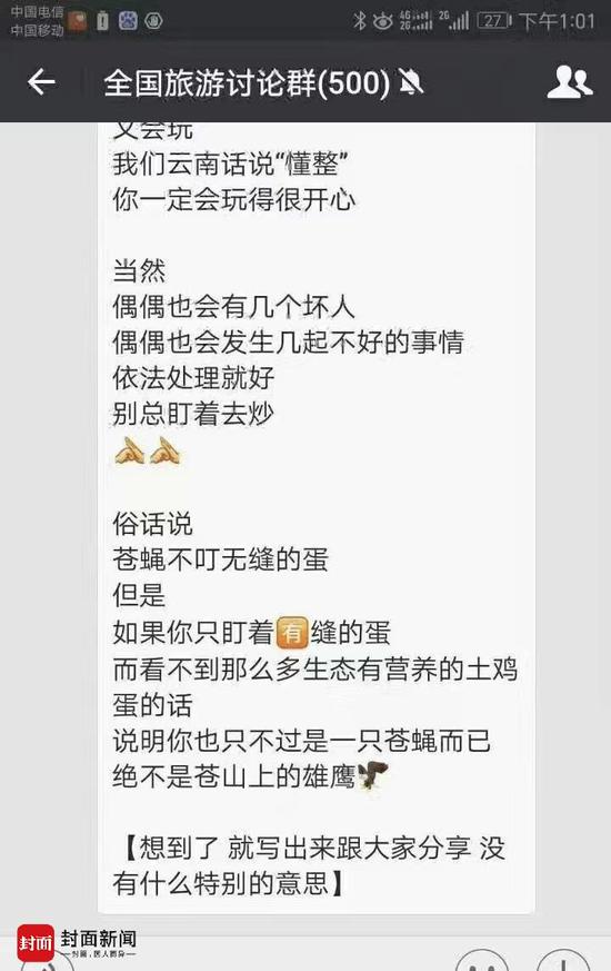 据封面新闻报道,2月17日,网友“烟云”通过微信朋友圈爆料称,云南旅发委市场处处长写诗“炮轰”舆论界走红网络。并贴出炮轰诗的截图。截图显示,这首诗的作者名叫黄大象。其在诗中这样写到:云南山美水美人更美,偶尔会发生几件坏事,大家不要盯着炒,盯着有缝的鸡蛋并不是苍山上的雄鹰,不过是只苍蝇而已。