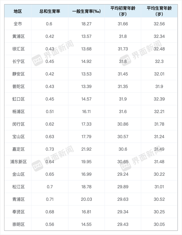 数据显示,上海全市总和生育率为0.6,户籍人口平均初育年龄31.66岁,平均生育年龄32.56岁。