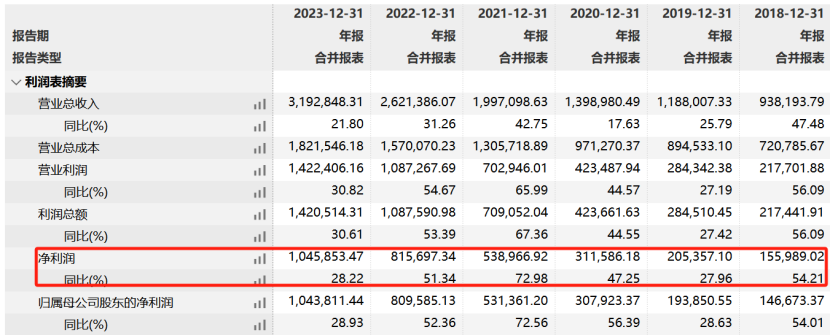 2019年,山西汾酒营收为118.9亿元,首次突破百亿元关口。2021年,营收为199.7亿元。2022年、2023年,营收陆续突破250亿元、300亿元。2023年净利润破百亿元,为104.58亿元。 2024年第一季度,实现营业收入153.38亿元,同比增长20.94%;归母净利润62.62亿元,同比增长29.95%。