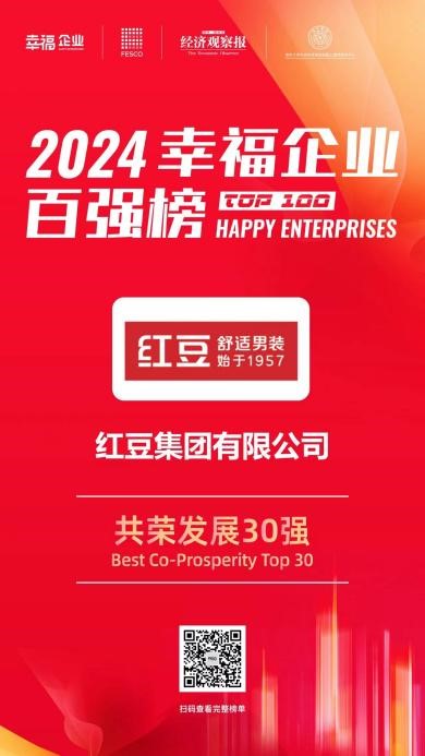 5月21日,“激活新质力 共建幸福力——2024幸福企业论坛暨百强榜颁奖典礼”在人民日报新媒体大厦举办,大会期间发布《2023幸福企业白皮书》,并重磅揭晓“2024幸福企业百强榜”。红豆集团凭借在员工思想引领、事业发展、生活保障、身心关怀方面的卓越成就,从众多企业中脱颖而出,荣膺“2024幸福企业百强榜”共荣发展30强,共同上榜的还有阿里云、小米、安踏、星巴克、西门子等品牌。