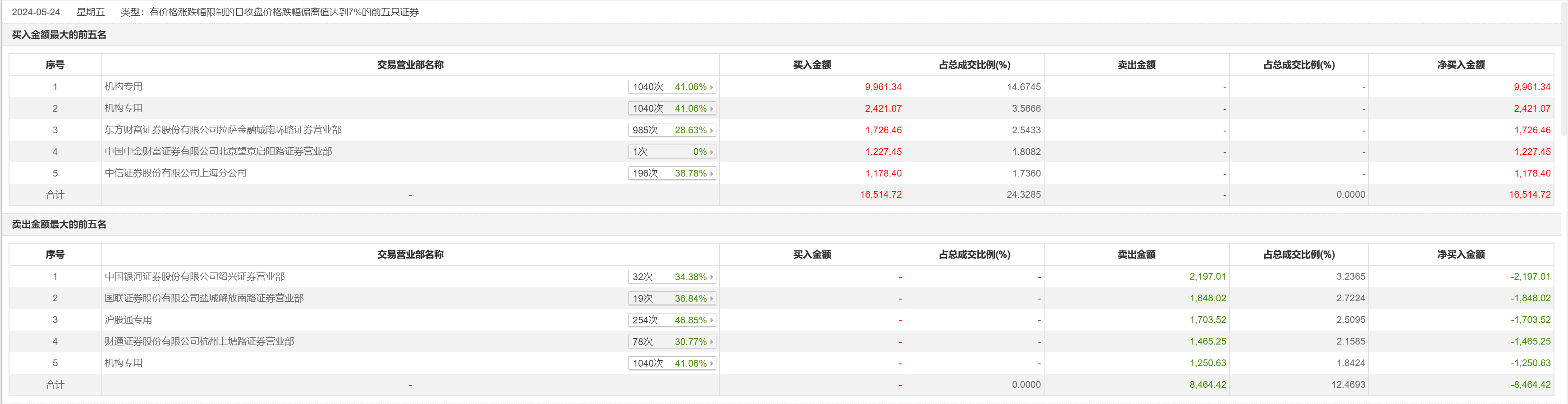 5月24日,城建发展今日跌停,龙虎榜数据显示,上榜营业部席位全天成交2.5亿元,占当日总成交金额比例为36.8%。其中,买入金额为1.65亿元,卖出金额为8464.42万元,合计净买入8050.3万元。