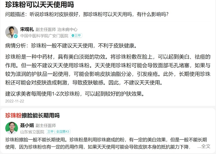 不少在职医生也曾公开表示,珍珠粉有一定的美白效果,但天天使用珍珠粉可能会导致面部毛孔堵塞、影响皮肤油脂分泌、导致皮肤敏感等问题。