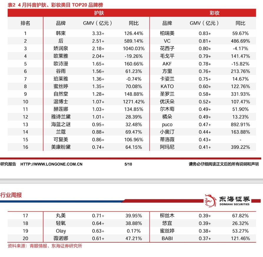 据青眼情报及东海证券研究所数据,今年4月,抖音平台护肤与彩妆总GMV达141.72亿元,同比增长32.66%,其中,护肤类目GMV超100亿元,同比增长31.2%。