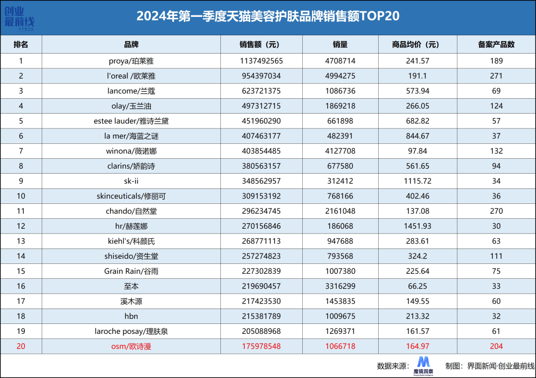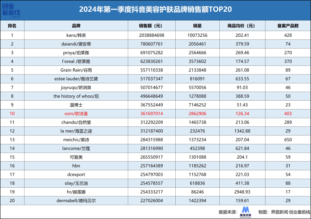 魔镜洞察向「创业最前线」提供的数据显示,今年1-3月,欧诗漫在抖音以3.62亿元销售额,居美容护肤品牌榜单第10位,超过自然堂、海蓝之谜等。而在天猫平台,则以1.76亿元销售额居第20位。