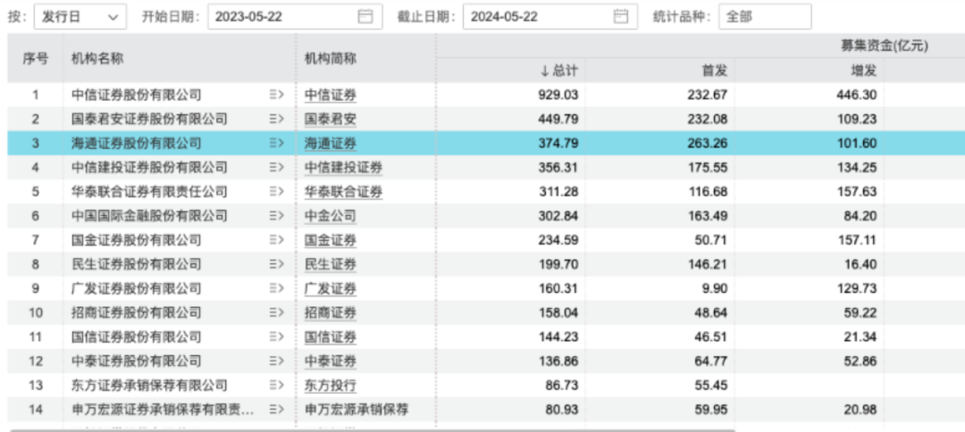 海通证券的股权融资保荐机构排名、申报项目数量排名、市场份额排名均靠前。Wind显示,2023年5月22日至今的一年时间,股权融资方面,海通证券总募集资金为374.79亿元,排行第三。承销金额排名中,首发项目排名第一,市场份额11.95%。