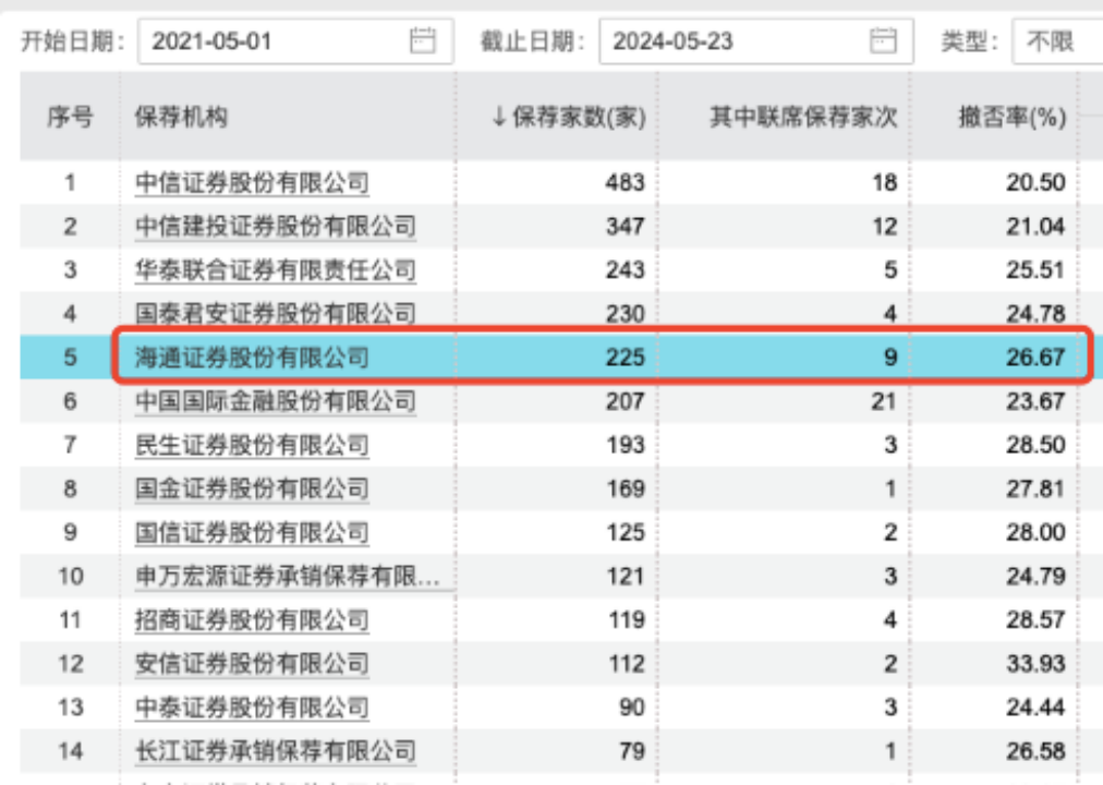 从撤否率来看,2021年5月至今,海通证券的撤否率达26.67%,排名第四。