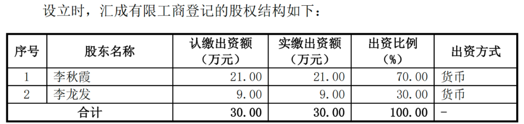 2006年7月28日,李秋霞和李龙发共同成立了汇成真空前身汇成有限,注册资本为30万元,其中李秋霞出资21万元,占注册资本的70%,李龙发出资9万元,占注册资本的30%。