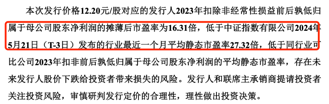 上市发行公告显示,本次发行价格为12.20元/股,对应市盈率为16.31倍,低于中证指数有限公司2024年5月21日(T-3日)发布的行业最近一个月平均静态市盈率27.32倍。
