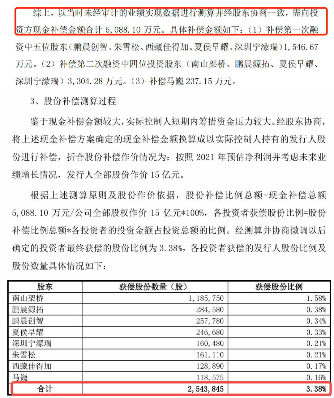 鉴于现金补偿金额较大,实际控制人短期内筹措资金压力较大,后经股东协商,将上述现金补偿方案确定的补偿金额,换算成以实际控制人持有的发行人股份进行补偿,投资者获偿股份数量总计2543845股,获偿股份比例为3.38%。