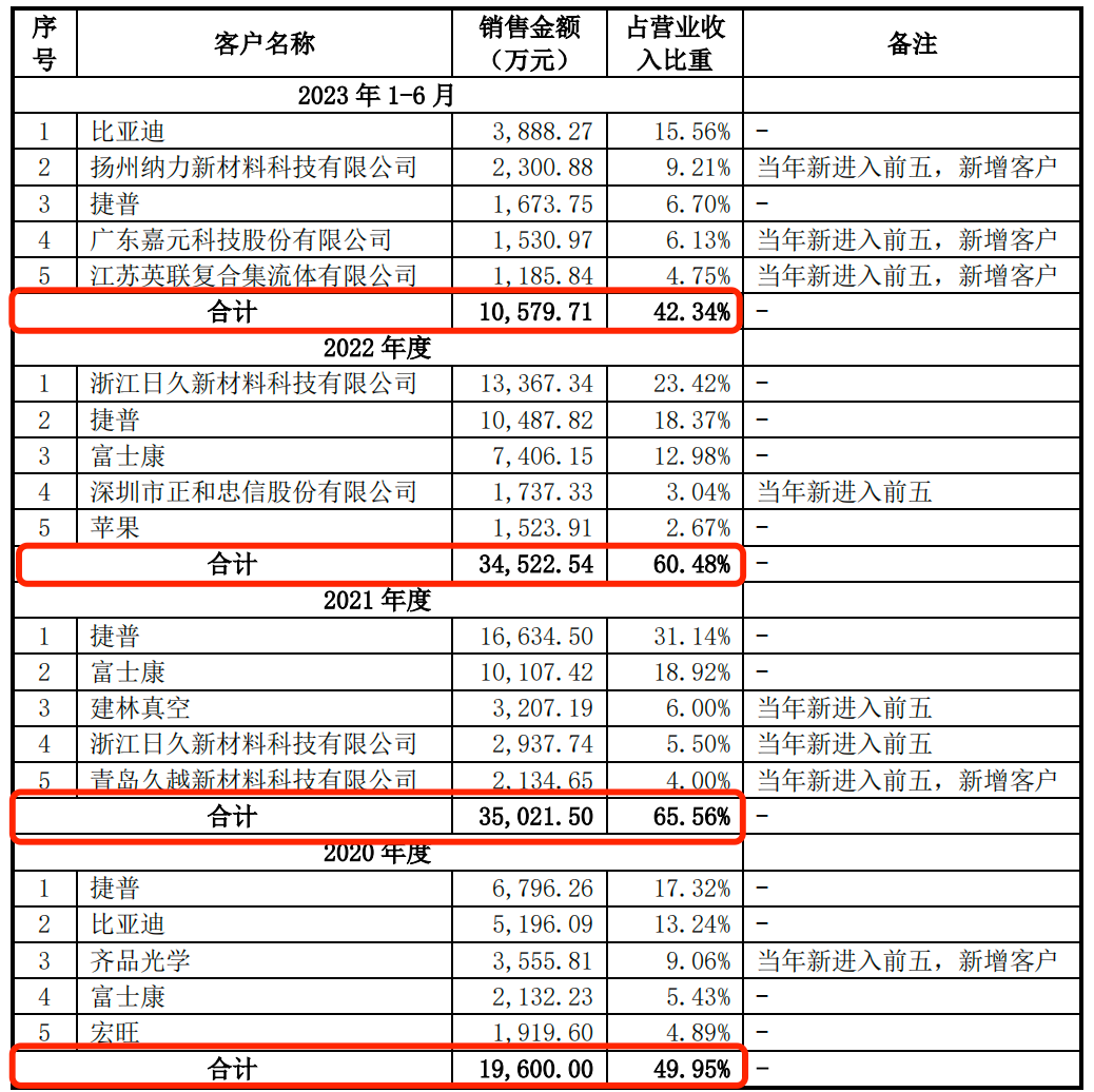 招股书显示,2020年-2023年上半年(以下简称“报告期”),公司前五名客户合计实现收入分别为1.96亿元、3.50亿元、3.45亿元和1.06亿元,占当期营业收入的比例分别为49.95%、65.56%、60.48%和42.34%,占比较高。