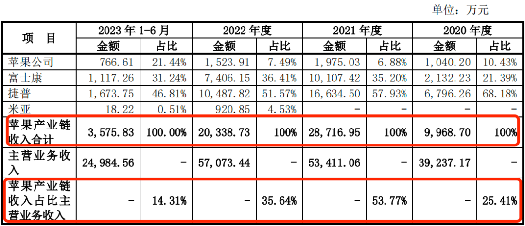 报告期内,汇成真空对苹果公司、富士康、捷普、米亚在内的苹果产业链厂商的合计销售额分别为9968.70万元、2.87亿元、2.03亿元和3575.83万元,占主营业务收入的比例分别为25.41%、53.77%、35.64%和14.31%。