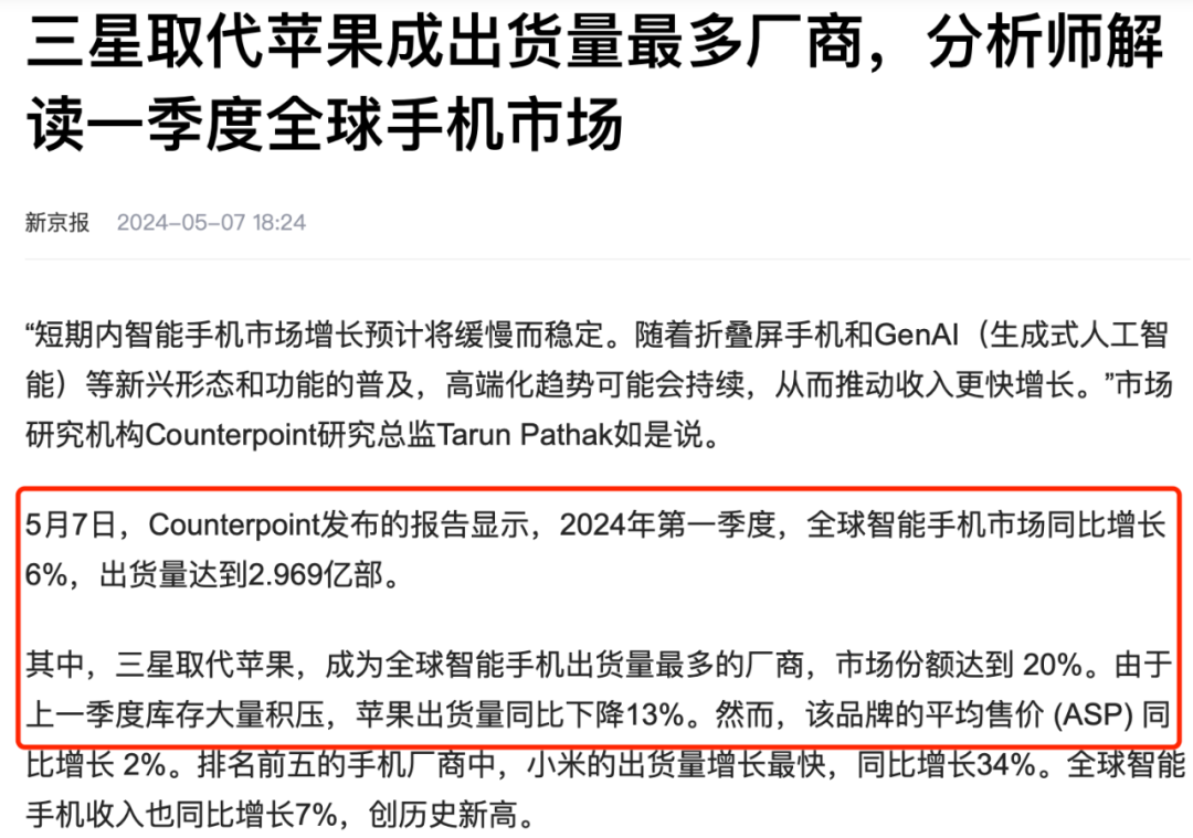 值得一提的是,5月7日,Counterpoint发布报告显示,2024年第一季度,全球智能手机市场同比增长6%,出货量达到2.969亿部。其中,三星取代苹果,成为全球智能手机出货量最多的厂商,市场份额达到20%。由于上一季度库存大量积压,苹果出货量同比下降13%。