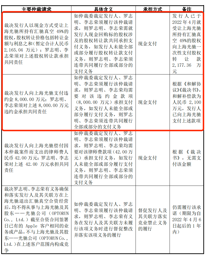 2022年9月5日,汇成真空、李志荣、罗志明与上海光驰就上述仲裁案件达成和解并签署《和解协议》,汇成真空向上海光驰转账2100万元,作为仲裁纠纷的和解补偿金。