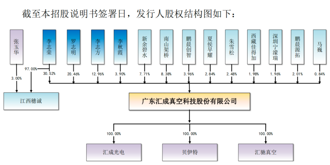 截至招股书签署之日,汇成真空的实际控制人为李志荣、罗志明、李志方、李秋霞。李志荣、罗志明分别直接持有公司30.52%、20.46%的股份,李志方、李秋霞直接及间接持有公司13.63%、7.51%的股份,四人为同胞兄弟姐妹。