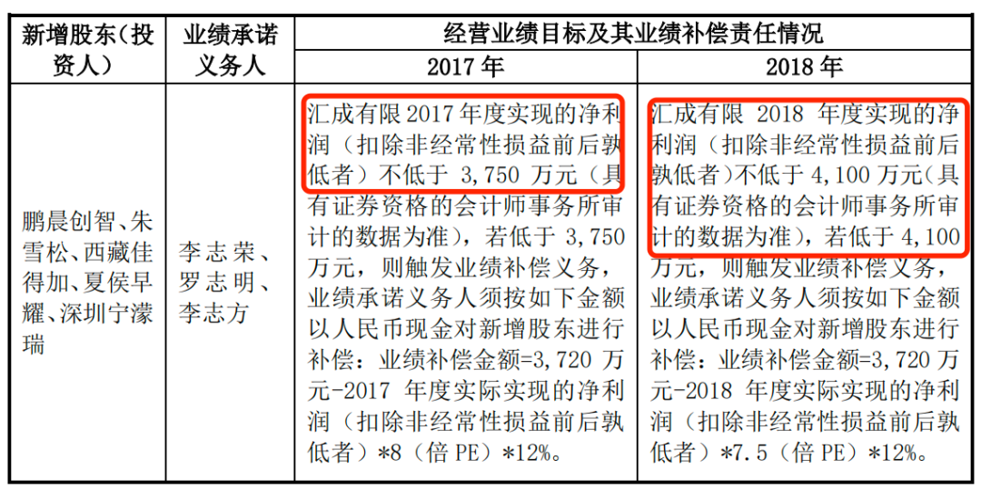 此外,李志荣与马巍签署股权转让合同,李志荣以500万元的价格将其持有的汇成有限0.75%股权转让给马巍,转让价格为108.37元/注册资本。同样对公司2018年-2020年的经营业绩目标及业绩补偿责任做了约定。