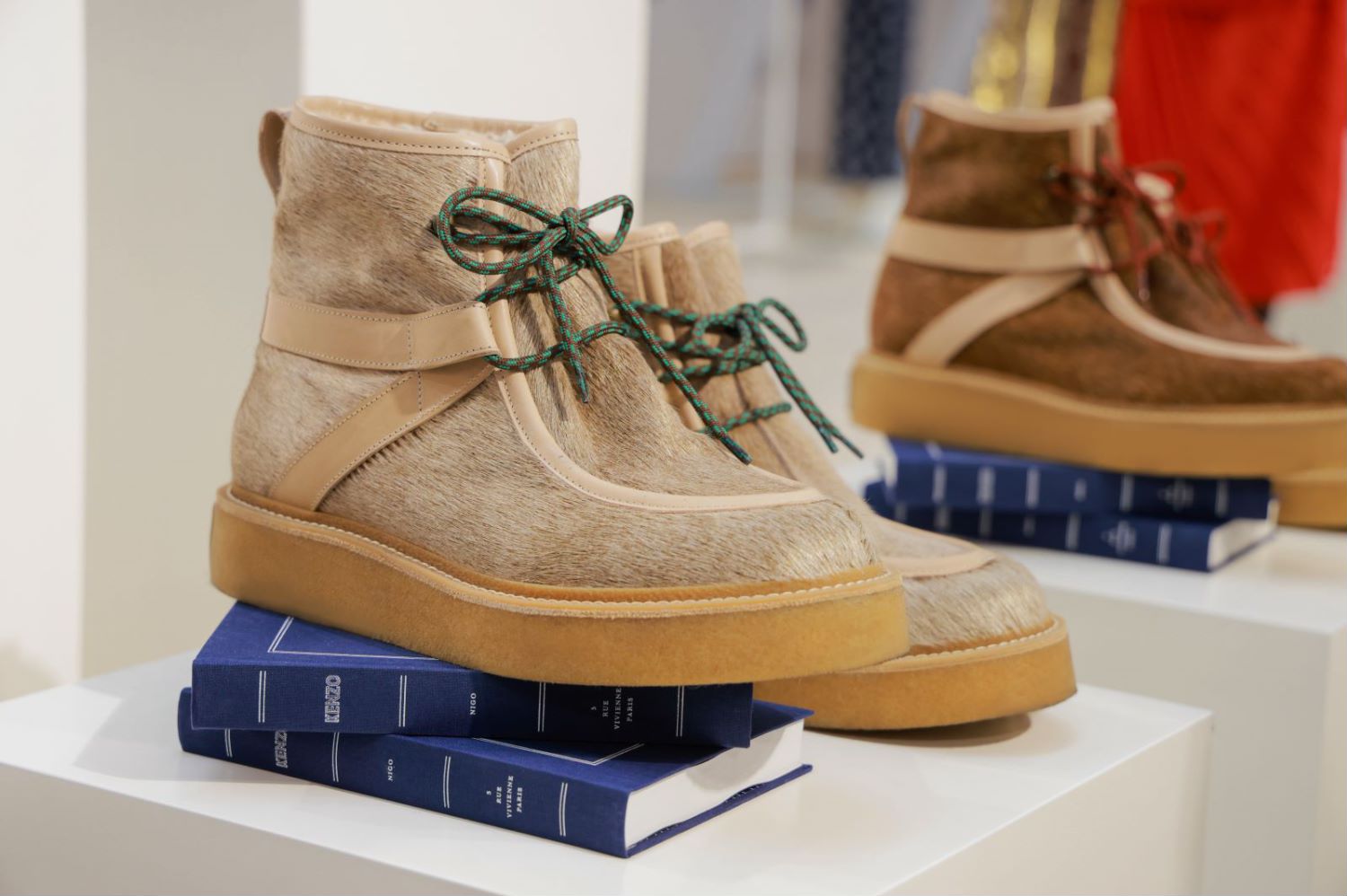 男女同款X Trainer运动鞋中底采用网状材料,由皮革、麂皮和橡胶材质制成。同时展出的还有由斑点马毛皮打造的冬季踝靴的KENZO Yuki,以及全新配色KENZO PACE运动鞋。