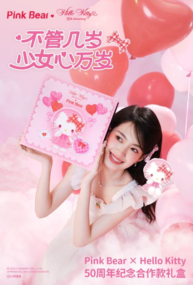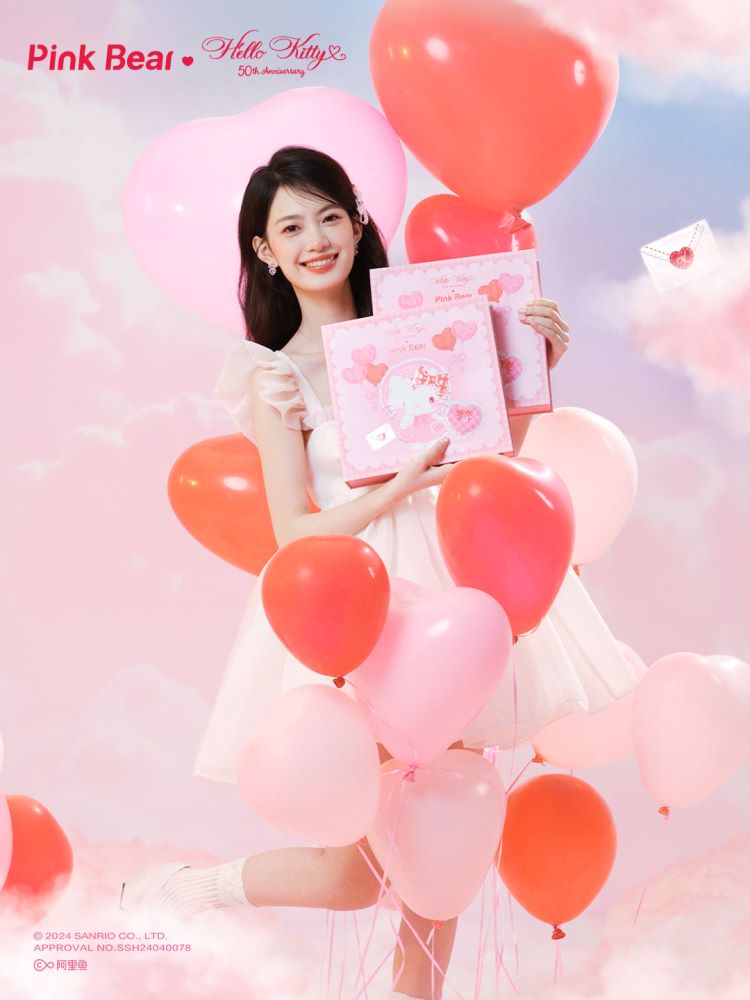 PinkBear X Hello Kitty 50周年纪念合作款礼盒采用浅粉色打底,结合爱心气球图案和Hello Kitty的经典印花,营造甜美温柔少女感。
