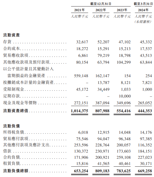 招股书显示,2021年、2022年、2023年及2024年前3月,该公司年末的现金及现金等价物分别约为2.72亿元、3.87亿元、3.5亿元、2.65亿元;同期流动负债总额分别约为6.53亿元、8.09亿元、7.84亿元、6.69亿元。