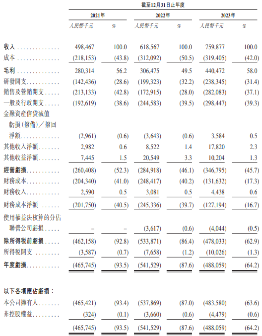 招股书显示,于2021年、2022年及2023年,该公司实现总收入分别为4.99亿元、6.19亿元及7.6亿元;实现毛利分别为2.8亿元、3.07亿元及4.41亿元;同期毛利率分别是56.2%、49.5%、58%。其中,该公司自2022年4月至2023年1月向机构客户(如地方政府及大学)提供2019年新型冠状病毒病COVID-19核酸检测服务。相关收入分别为1.51亿元及30万元,分别占2022年、2023年总收入的24.4%及0.04%。