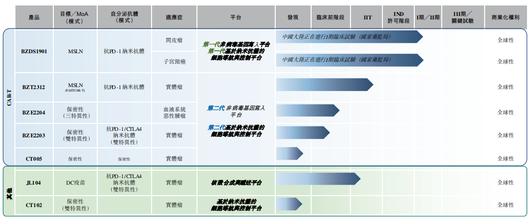 截至最后实际可行日期,该公司已确定及开发了一个由七款在研产品(包括BZDS1901,我们独立开发的CAR-T在研产品,以MSLN为靶点并分泌抗PD-1抗体)组成的管线;已于2023年3月获得在中国开展BZDS1901治疗间皮素阳性实体瘤的I期和II期临床试验的IND批准。上海细胞治疗集团称,虽然所有的在研产品目前尚未被批准商业化,且尚未从公司的在研产品销售中产生任何收入,但公司“预计在未来几年会将我们的一款或多款在研产品商业化”。