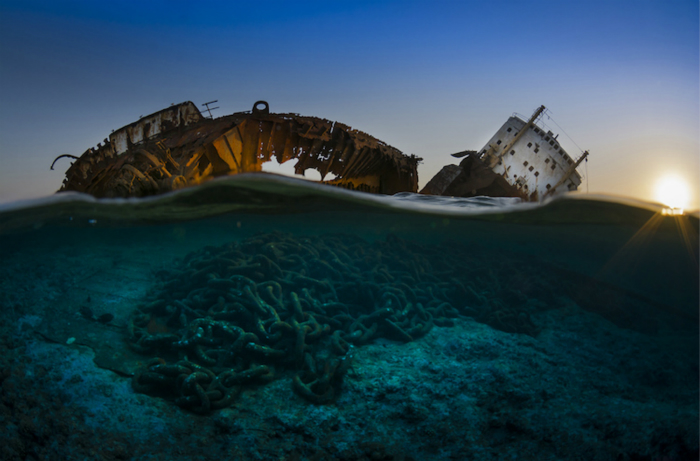“这是栖息在黄金暗礁上的洛拉号的残骸,位于西奈边缘的蒂朗海峡。她的下面有一堆船锚的铁链,勾勒出鲸鱼的形状。这一刻,残骸构成了生态系统的一部分。软珊瑚成长得非常快,成为了成群的幼鱼的庇护所,但同时,它们也为周边的环境带去了毁灭性的影响。残骸坐落于黄金暗礁的顶端,受波浪的冲刷而逐渐被侵蚀。去年夏天,一部分上层的结构崩塌了,残骸失去了顶层部分,看上去十分具有戏剧性效果。如此一来,几十年后,暗礁就能脱身于这个庞然大物的残骸、重获自由了。”